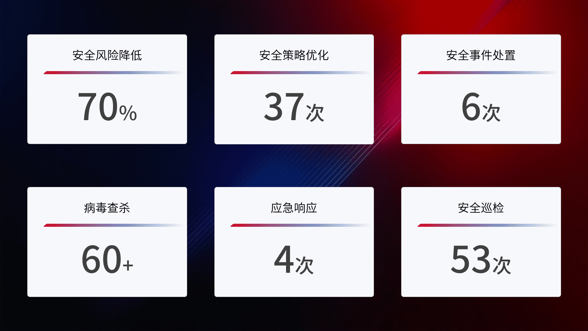 提供全面的安全事件报告体系,,包括处置报告、、周报、、、季度和年度总结,,,,结合持续监控,,,,帮助客户深入了解网络安全状况。。。